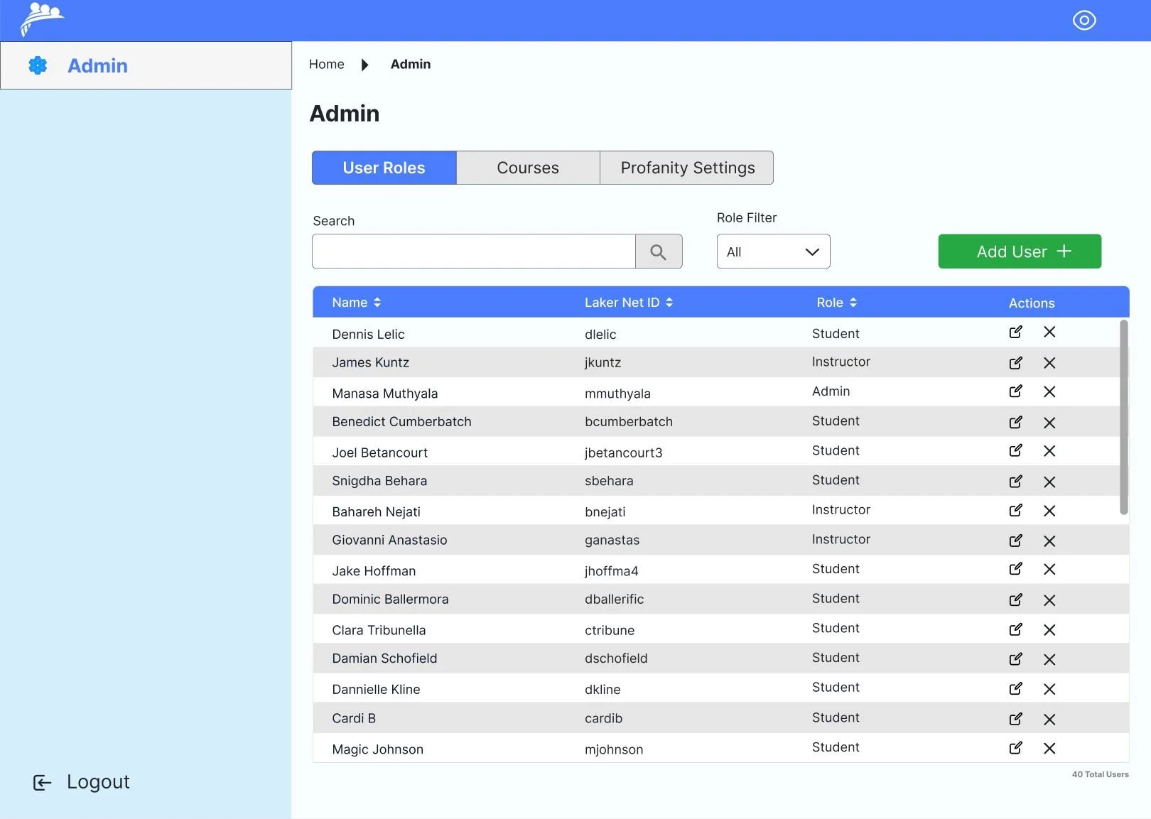 The admin role was created by the request of the stakeholders for the purpose of allowing administrators at institutions to be able to moderate all user roles, and courses available at the institution, as well as edit profanity settings so that the system may detect any forbidden words that may be contained in a document when it is uploaded for submission.