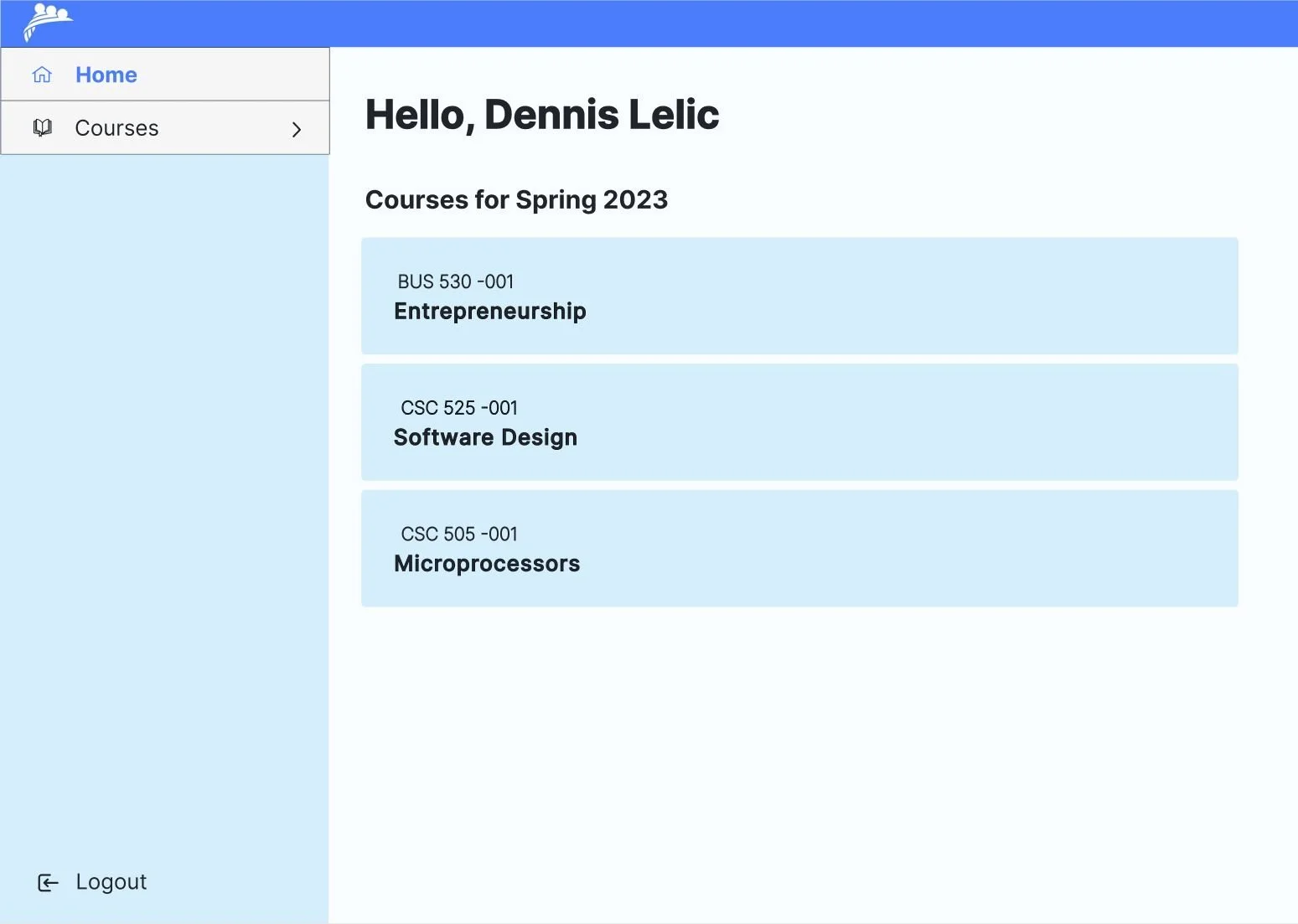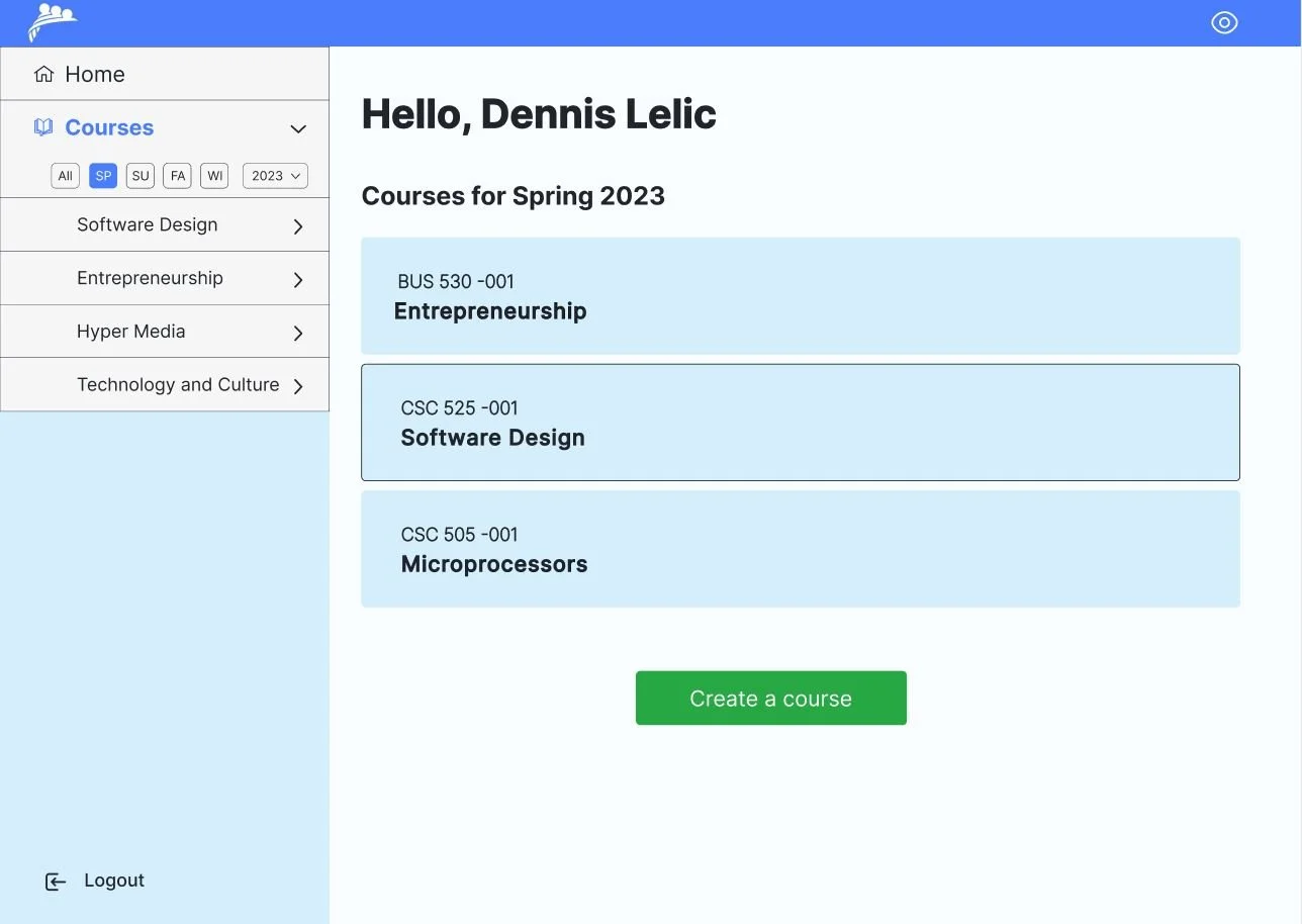 The old instructor homepage design provided course instructors with a basic navigation route to the courses they had available for that current semester but lacked an easy way for users to navigate between courses, students within courses, and the various assignments found within each course.