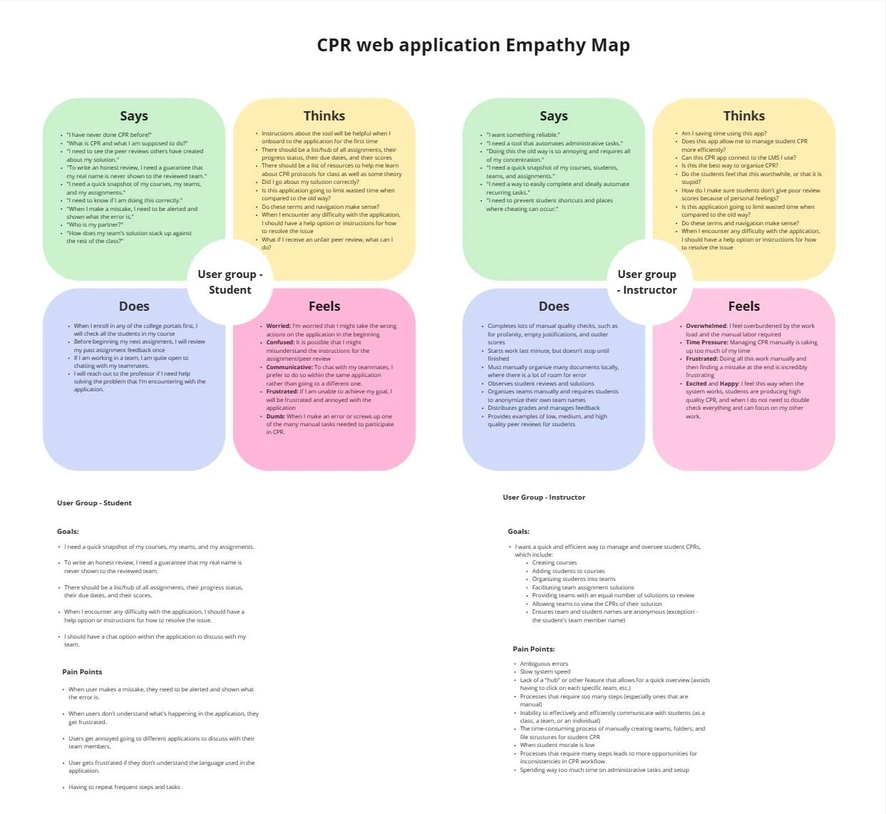 An empathy map was created to gain an understanding of what users might say, think, do, or feel while interacting with the CPR Tool. This provides an organized manner to understand the complexity of user needs and goals, along with their pain points and displeasures when using the tool.