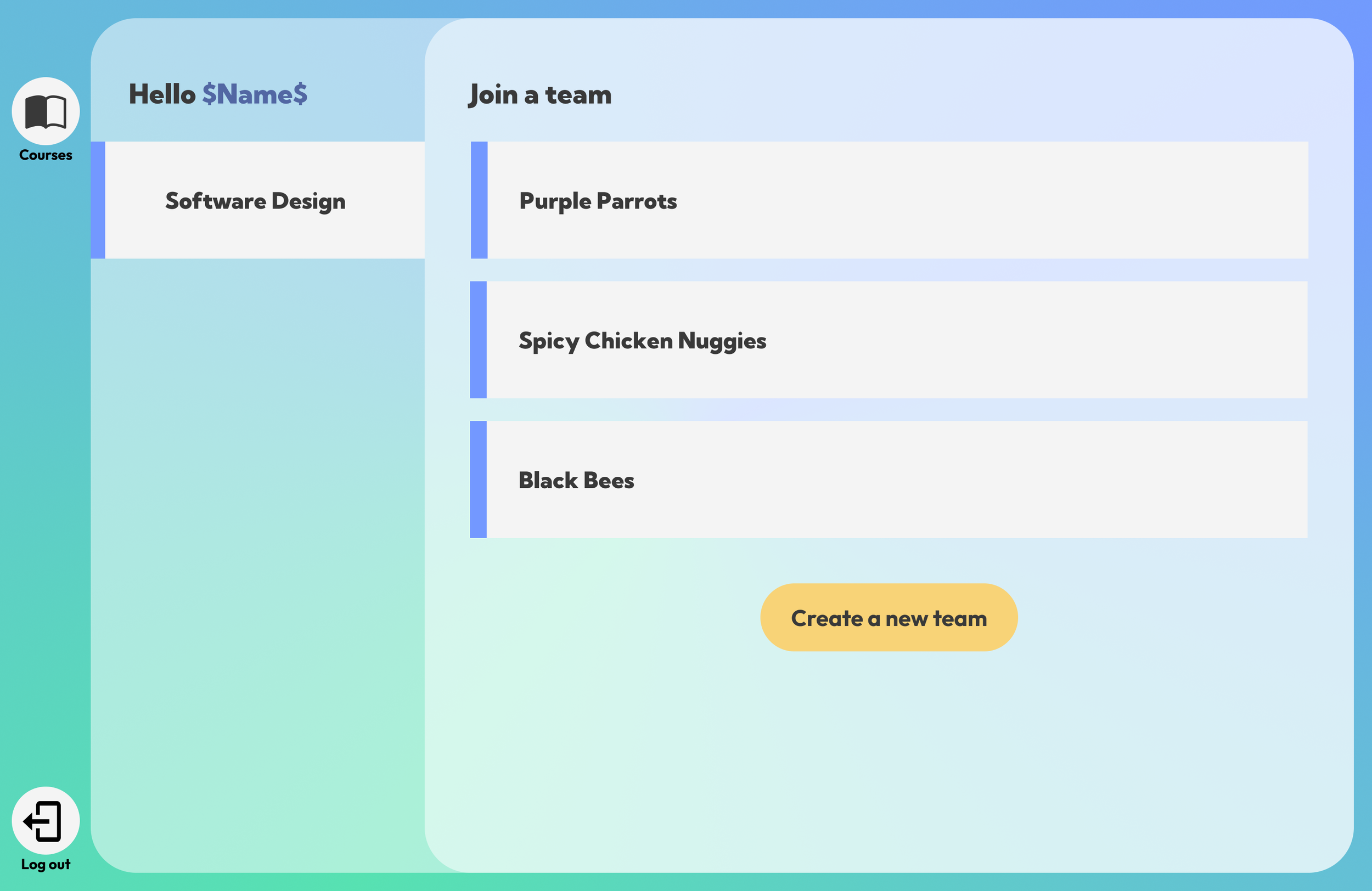 The old student home page immediately presents users with one of their courses, showcasing anonymous teams they may join for peer reviews. Students are unable to navigate to specific sections within a course directly from this page and must proceed one page at a time.