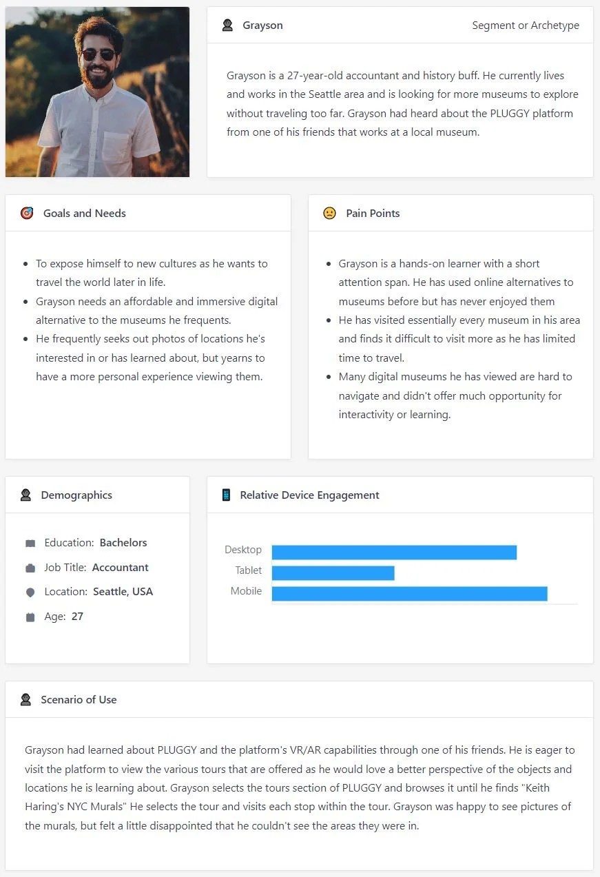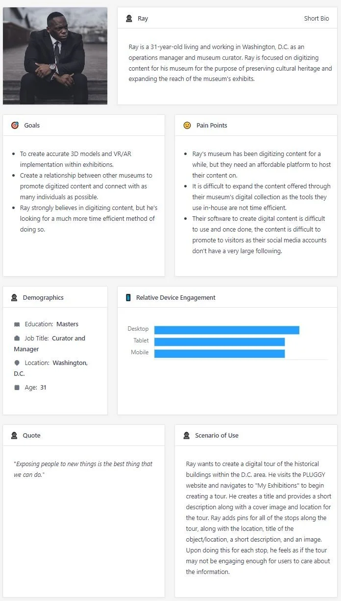 User personas were created as a fictitious representation of end users. Two user stories were created to depict different use cases of the PLUGGY platform, specifically creating a user story that represents an individual who works as a museum curator and will use PLUGGY as a tool to preserve cultural heritage and allow access to their exhibits. The other user story was created to represent an individual who will use PLUGGY as a means of viewing and accessing digital exhibits as an informational tool.