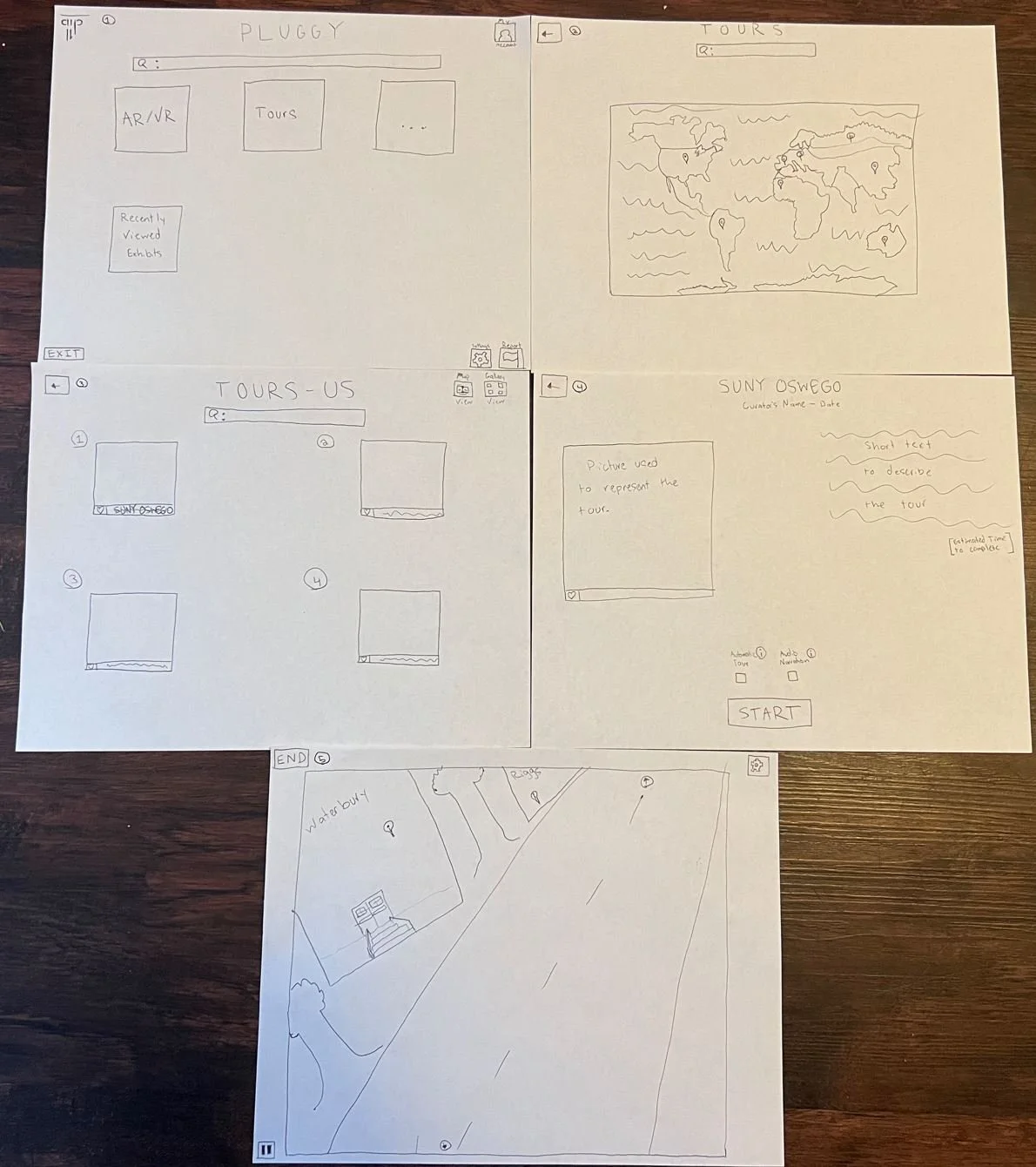 Paper mockups were created to envision how the user should see and interact with the platform in VR. Icons were made to be large panels to ensure that users would be able to easily navigate to and select the different features offered by PLUGGY using the VR headset’s controller, while also matching the current aesthetic of the PLUGGY platform.
