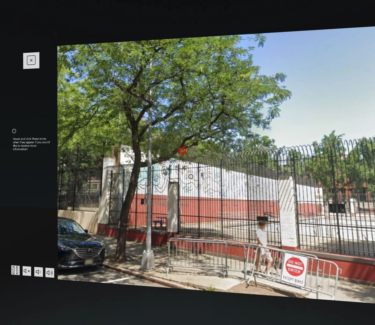 A prototype was created using Figma to showcase how users may be able to view tours utilizing a VR version of Google Street View, rather than seeing a picture of the subject and a satellite picture from Google Maps of the location. Users are presented with the ability to move through the tour automatically with accompanied audio narration, or they may embark on the tour at their own pace, cueing the audio narration to play at their desire. Users will be able to control the tour using the VR set’s handheld controller, with their cursor indicated by a red circle. Users will be able to control their point of view by rotating their heads, but are presented with a border around their field of view presenting various controls for the tour.