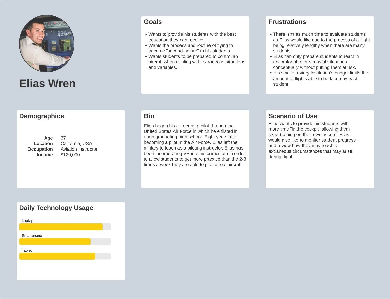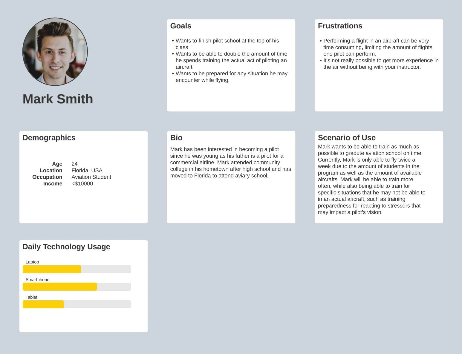 User personas were created as a fictitious representation of end users. During development, it was decided that the project would benefit from creating two separate user roles. One was created for individuals that use the product for the purpose of training their piloting skills, known as the student role. the other user role was created for individuals to allow them to moderate users within the student role. This allows pilot instructors at institutions that incorporate this product into training to facilitate the training of the students and ensure that they are acquiring the correct trainings and materials.