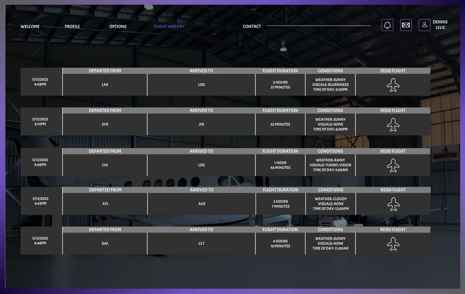 The flight history feature was created for students to quickly identify and re-access any flights they may have completed in the past, not limited to the ones assigned by an instructor. Students can easily redo any flights they have completed if there is a specific task or skill the user wants to focus on. This allows for easy and repeatable trainings.