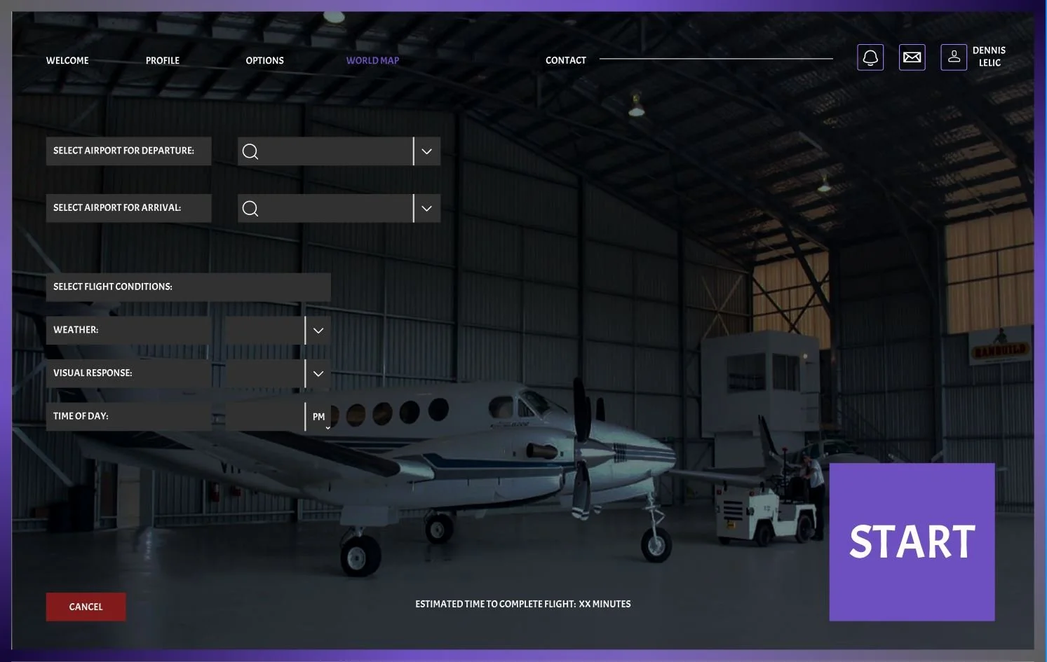 From here, users are able to create their own custom flights by selecting both the airport they will depart from, as well as the one they will arrive to. Users are able to customize other variables of their flight such as the weather they will be flying in, whether or not they experience a simulation of visual impairment, and the time of day.